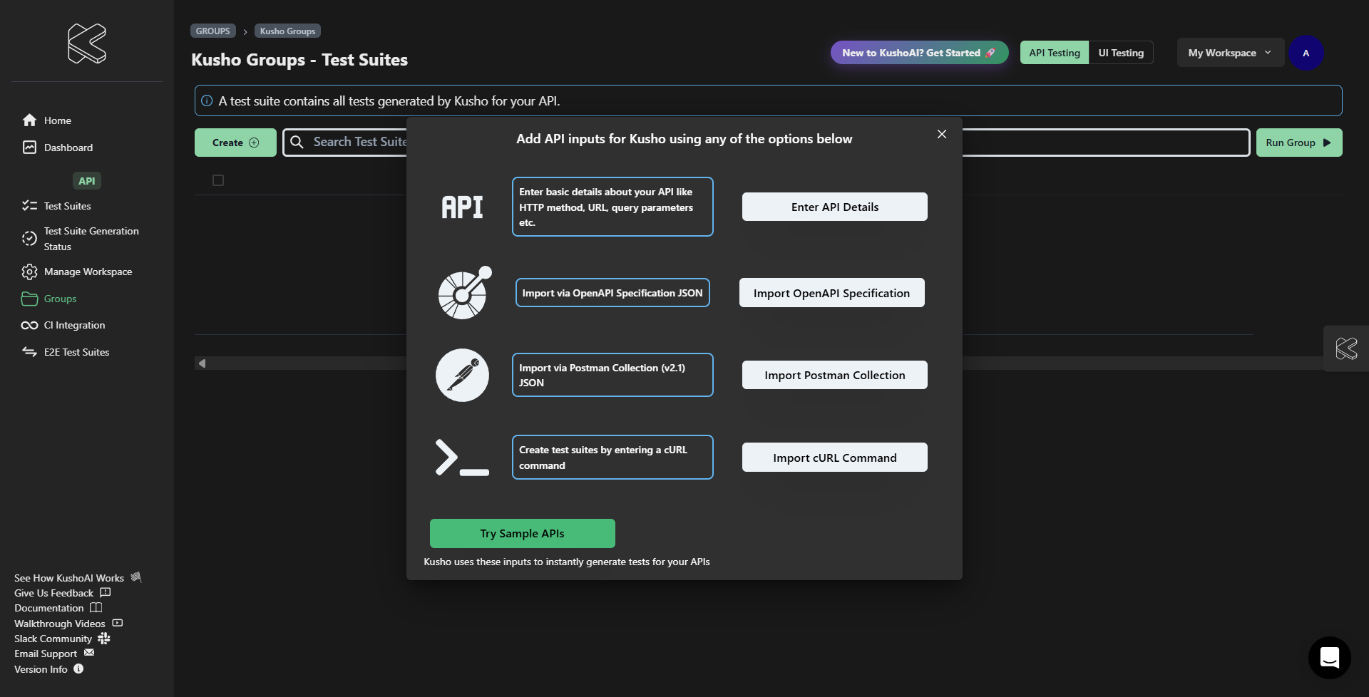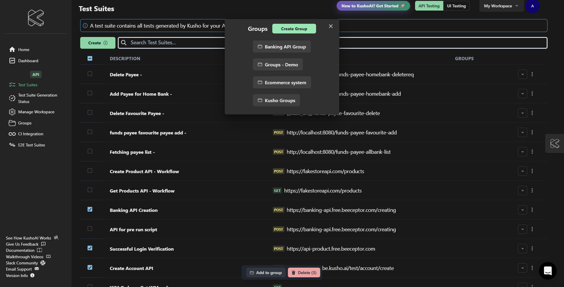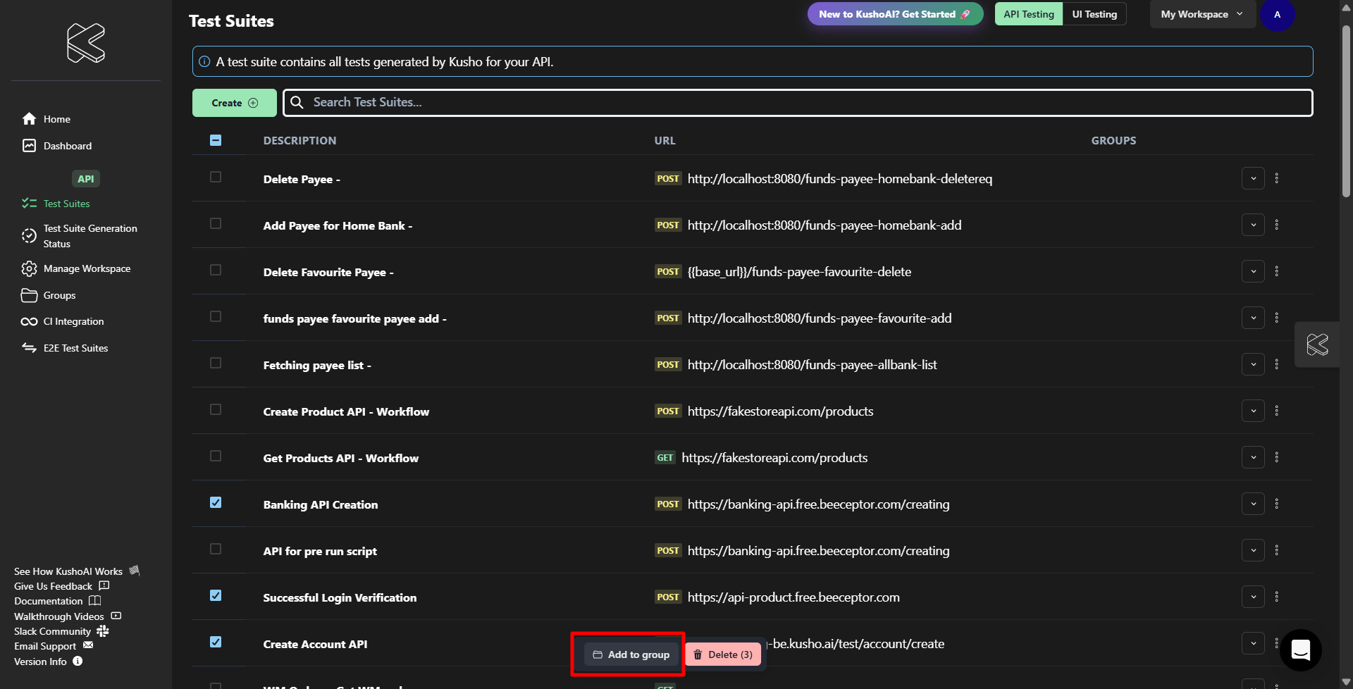 - Select multiple test suites using the checkboxes on the left on the test suite page.