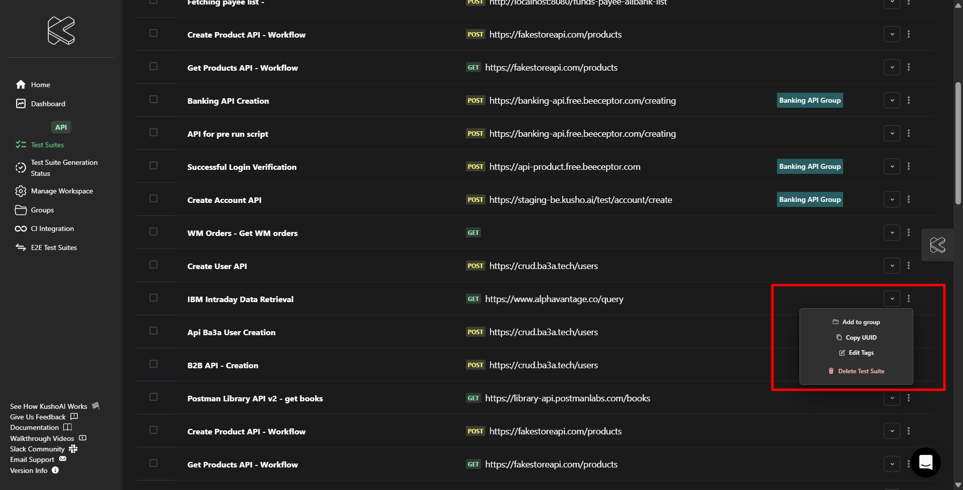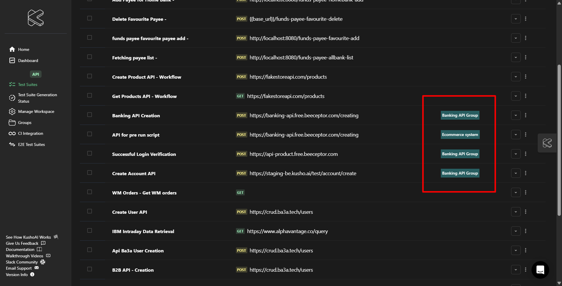 - Multiple group tags may be displayed (e.g., "Banking API Group", "Ecommerce system").