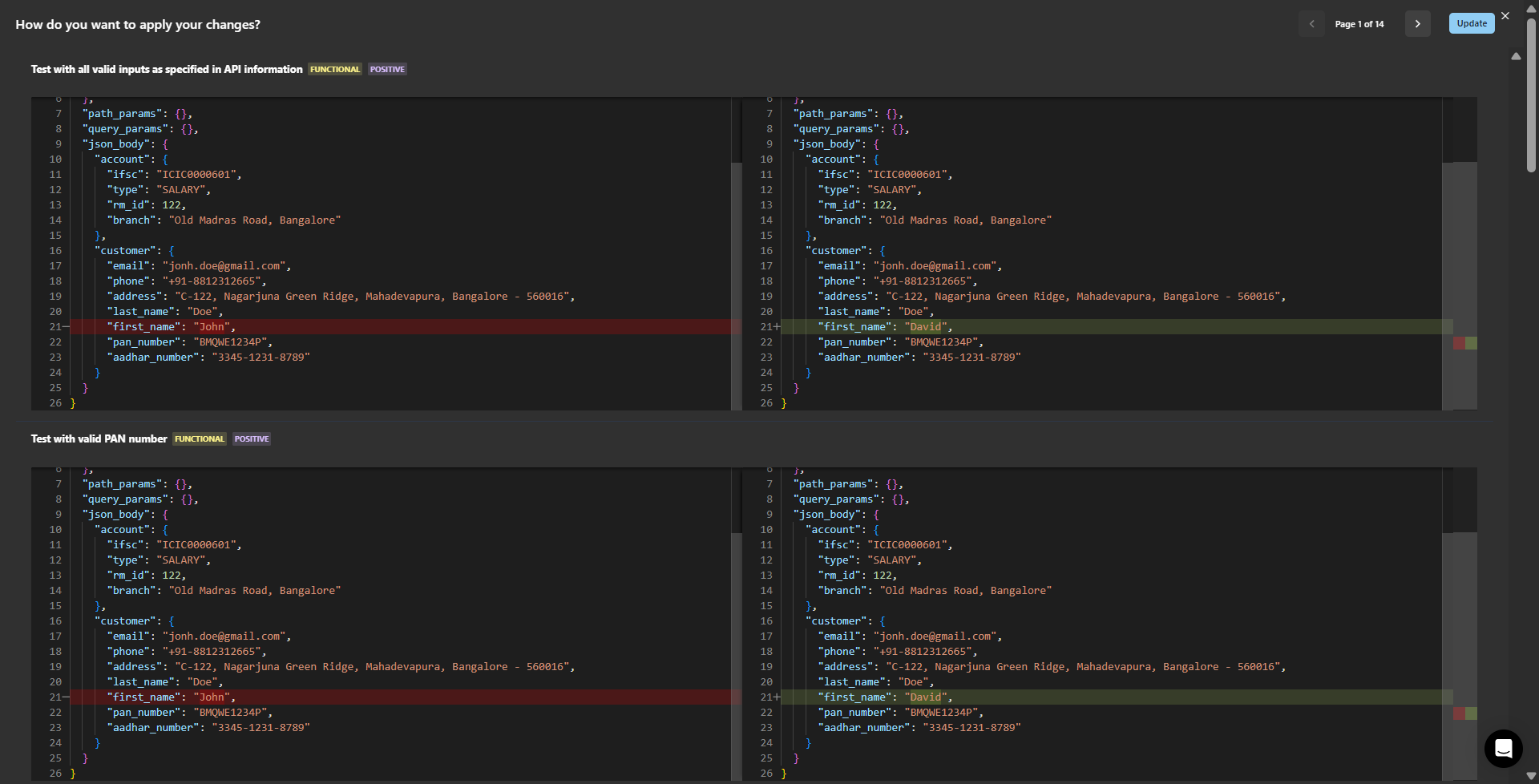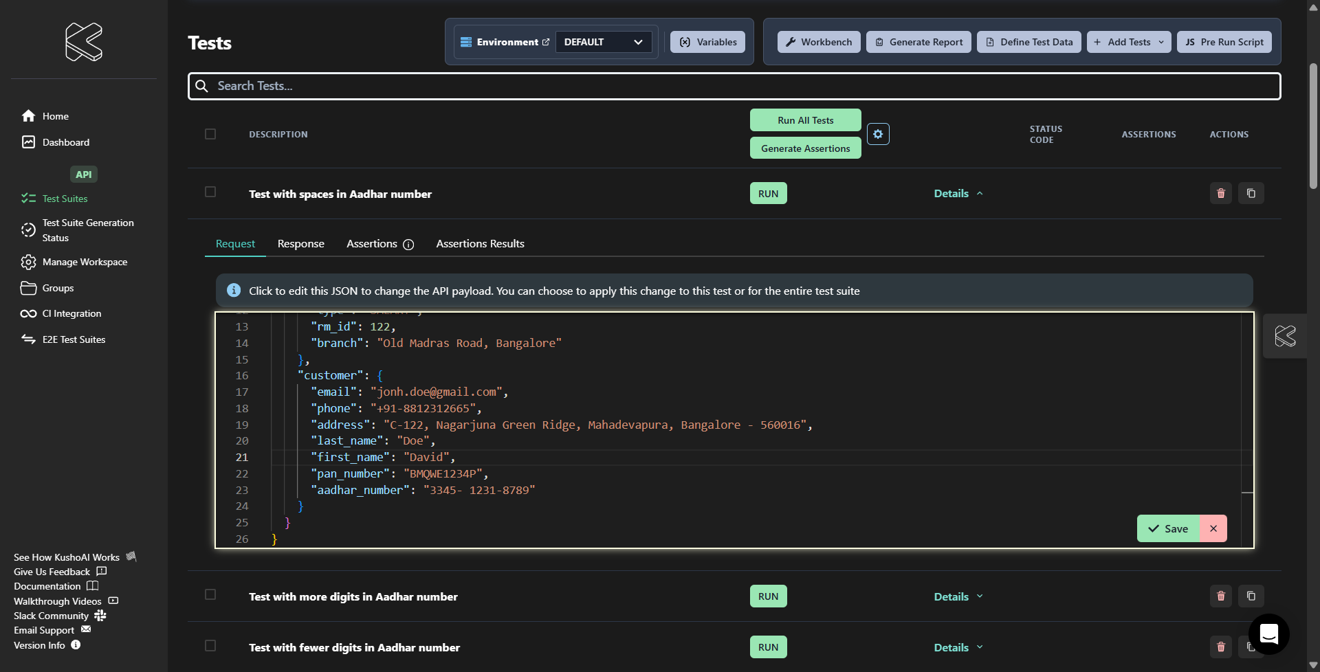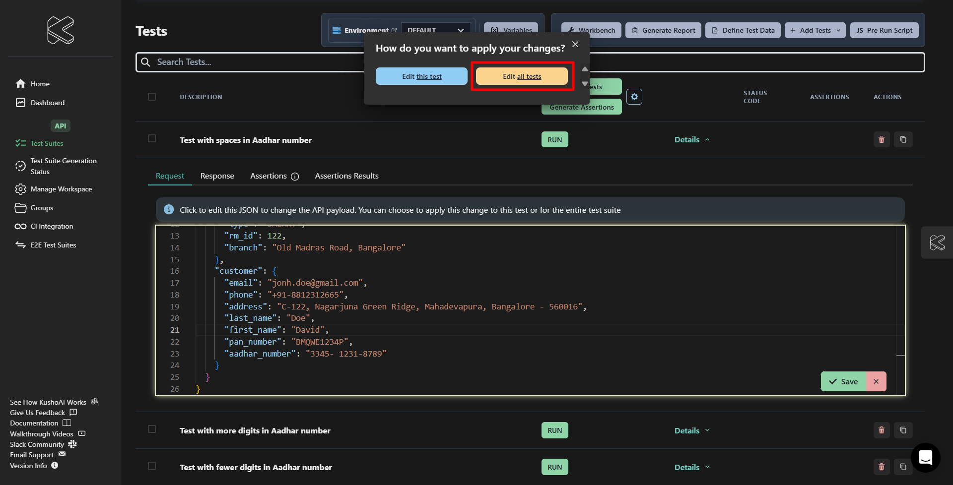 - The JSON editor will open, allowing you to edit your test case quickly. To save your changes, click the save button in the bottom right corner.